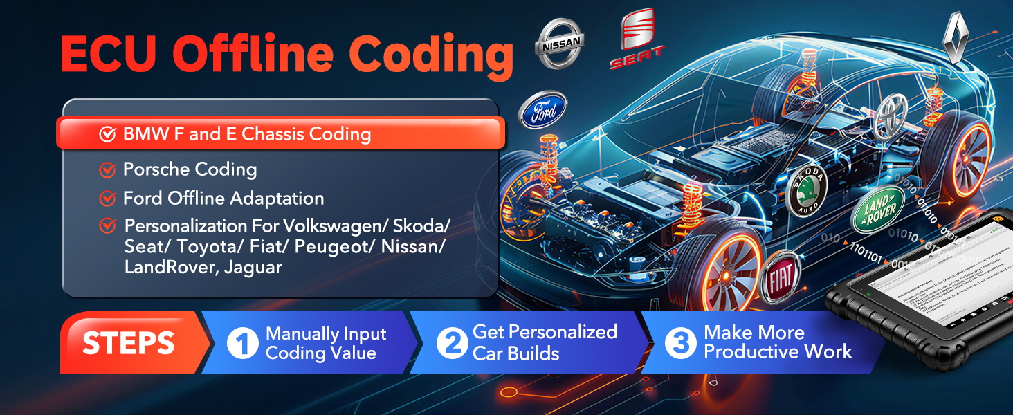 Codare și adaptare ECU – funcții dedicate pentru BMW (seriile E și F), Porsche și Ford, dar și pentru alte mărci de top, cu posibilitatea de a personaliza configurația vehiculului.