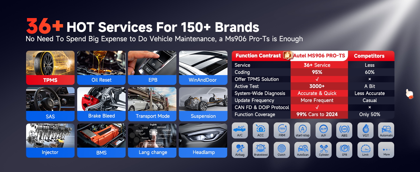 Autel MaxiSYS MS906 PRO-TS este un tester auto profesional multimarcă de ultimă generație, compatibil cu peste 15.000 de vehicule. Oferă diagnoză completă pe toate sistemele, programare și resetare TPMS, codare ECU online și offline, control bidirecțional, peste 36 de funcții de întreținere și suport pentru protocoale moderne DoIP și CAN FD.