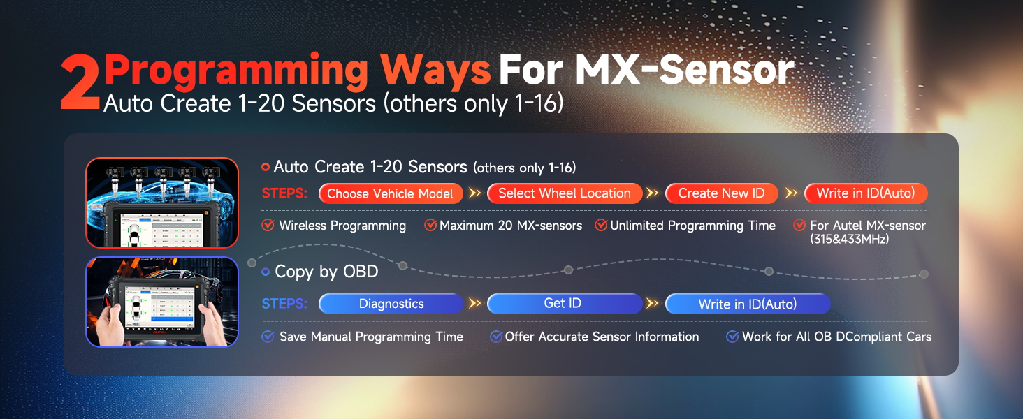 Funcții complete pentru monitorizarea presiunii în pneuri (TPMS) – activare, citire, programare și recalibrare pentru 99% dintre senzorii originali existenți pe piață; programarea senzorilor Autel MX se face rapid și eficient.