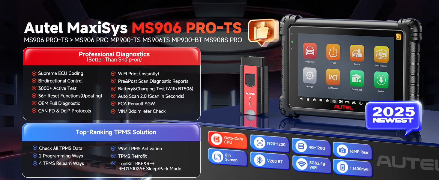 Autel MaxiSYS MS906 PRO-TS este unul dintre cele mai avansate testere auto multimarcă disponibile în 2025, destinat atelierelor de reparații și profesioniștilor în diagnoza auto. Cu un hardware puternic și software de ultimă generație, acest echipament asigură diagnoză la nivel de producător (OE), funcții complete pentru sistemul de monitorizare a presiunii în pneuri, programare și codare unități electronice, control bidirecțional, peste 3000 de teste active și mai mult de 36 de funcții de întreținere și resetare.
